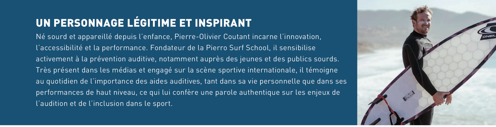 Fort du lien qui les unit, Audilab et Oticon annoncent la signature d’un partenariat d’influence d’un an avec Pierre-Olivier Coutant, surfeur handisport, éducateur sportif et figure engagée dans la sensibilisation à l’inclusion et à la santé auditive.