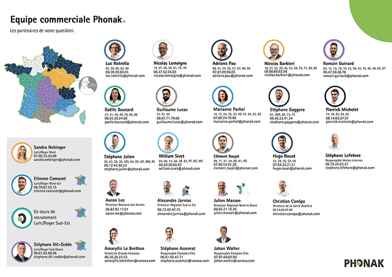 Son équipe commerciale composée de 26 collaborateurs est mobilisée pour répondre aux besoins des audioprothésistes et de leurs patients.
